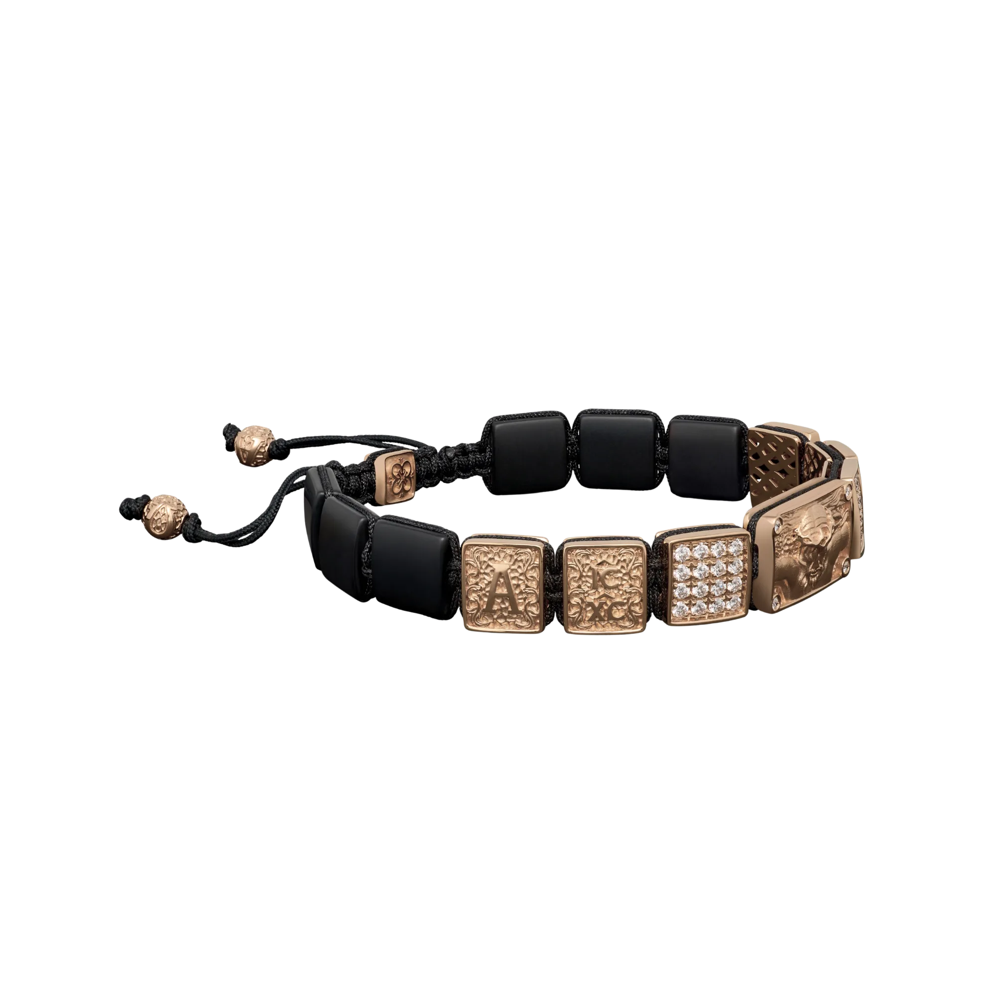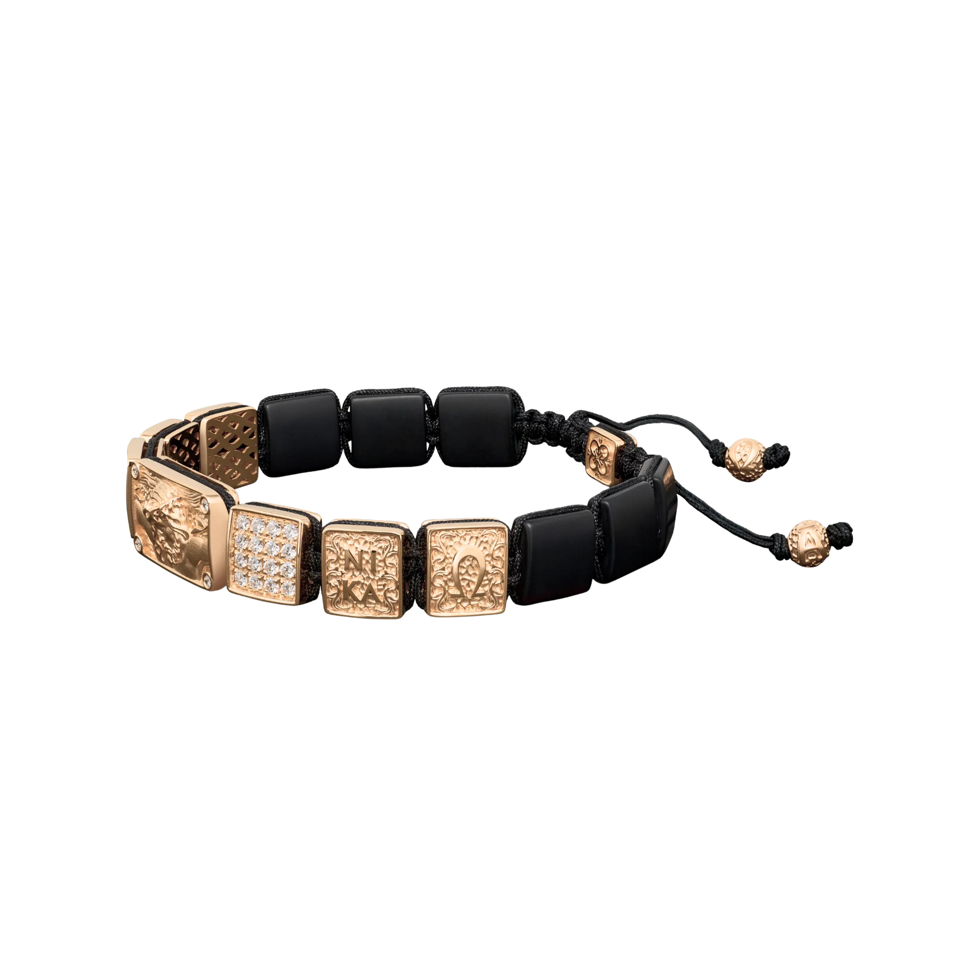 Crucified Jesus Christ Bracelet in 18K Rose Gold, White Diamonds and Black Onyx