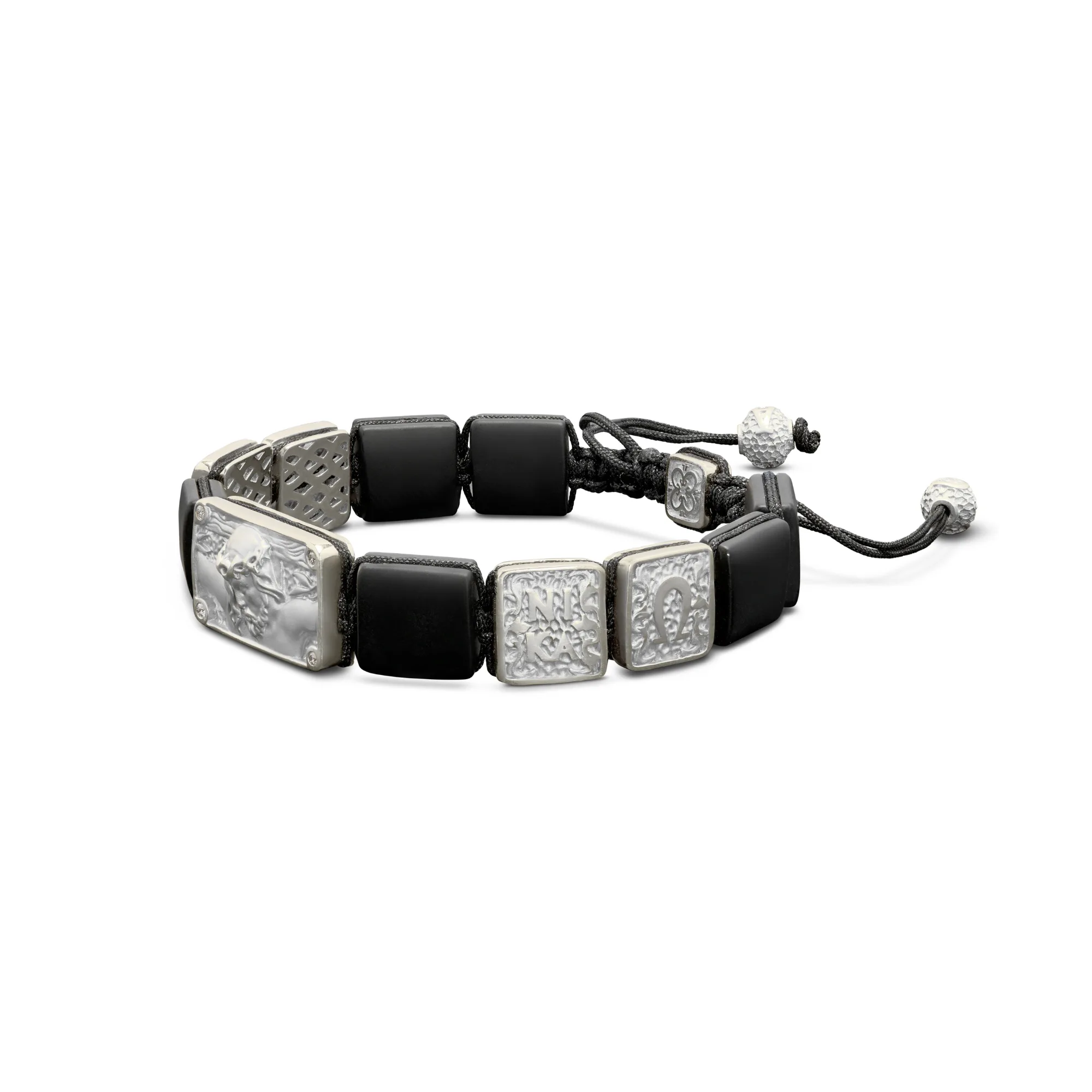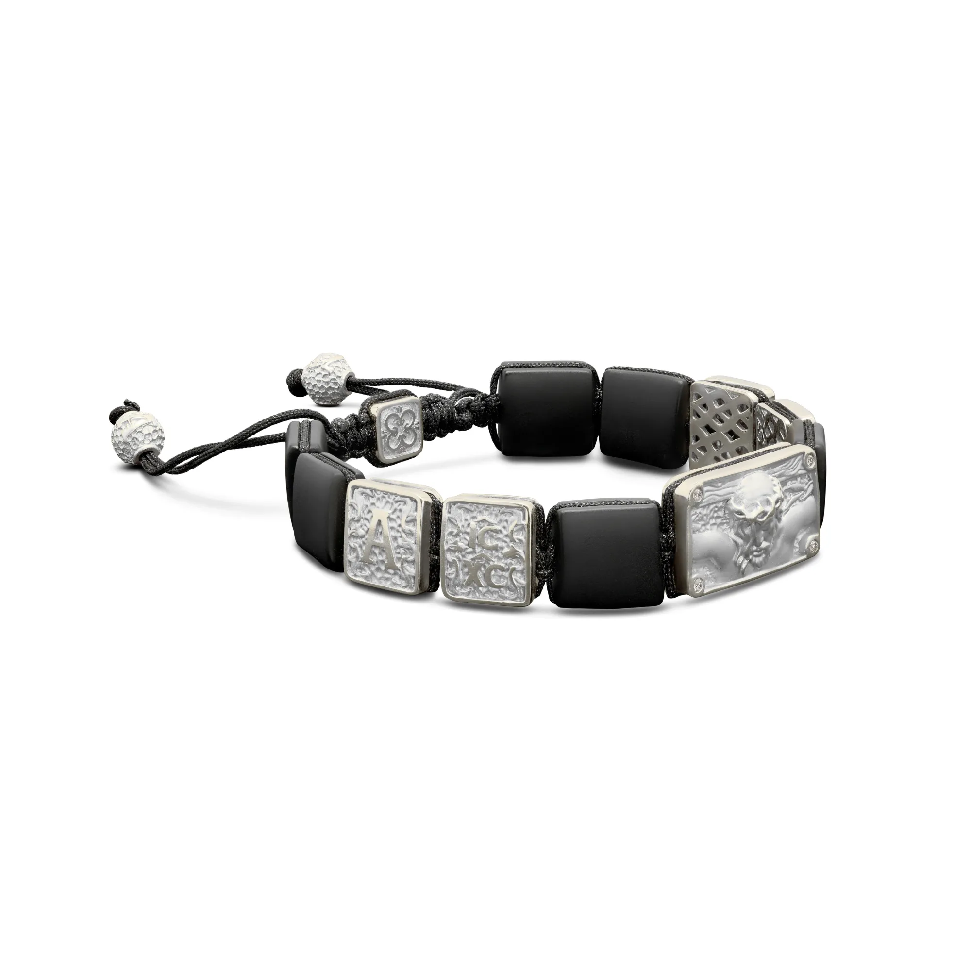 Crucified Jesus Christ Bracelet in 18K White Gold, White Diamonds and Squared Black Onyx
