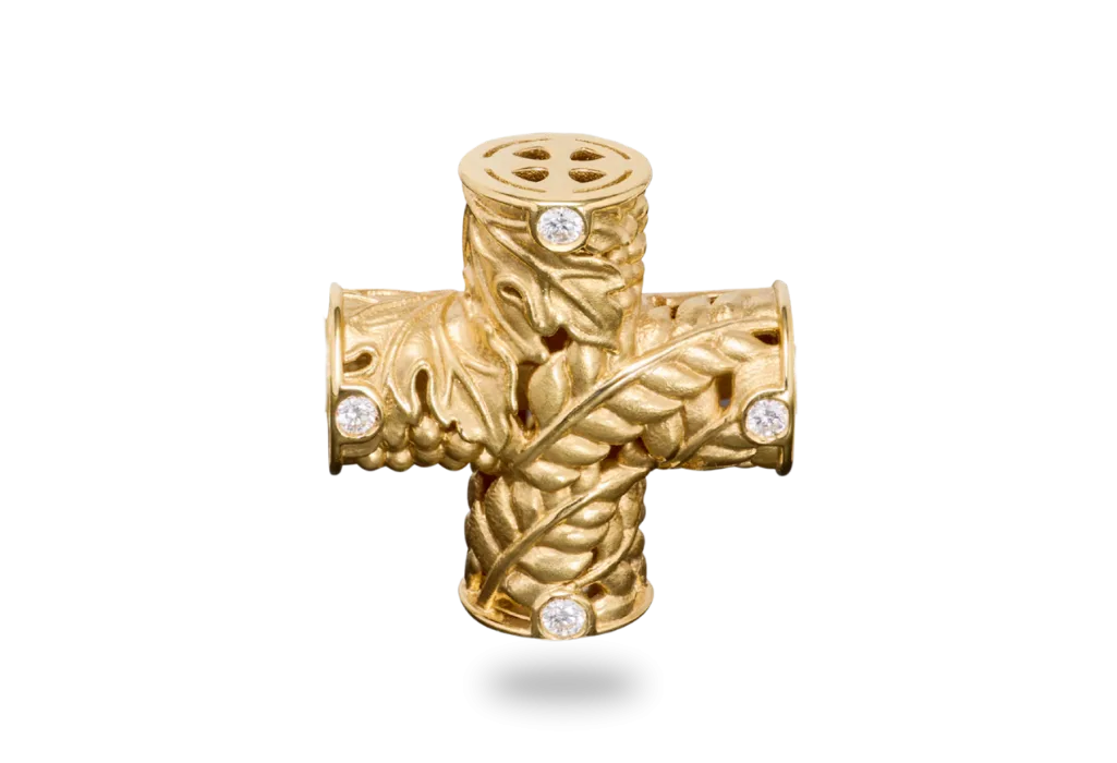 In this collection, 18K gold transforms into a hymn of life and gratitude. The details of each cross are inspired by the sacred symbols of the mystery of the Holy Communion: wheat for the body, vine and grapes for the blood and eternal life.