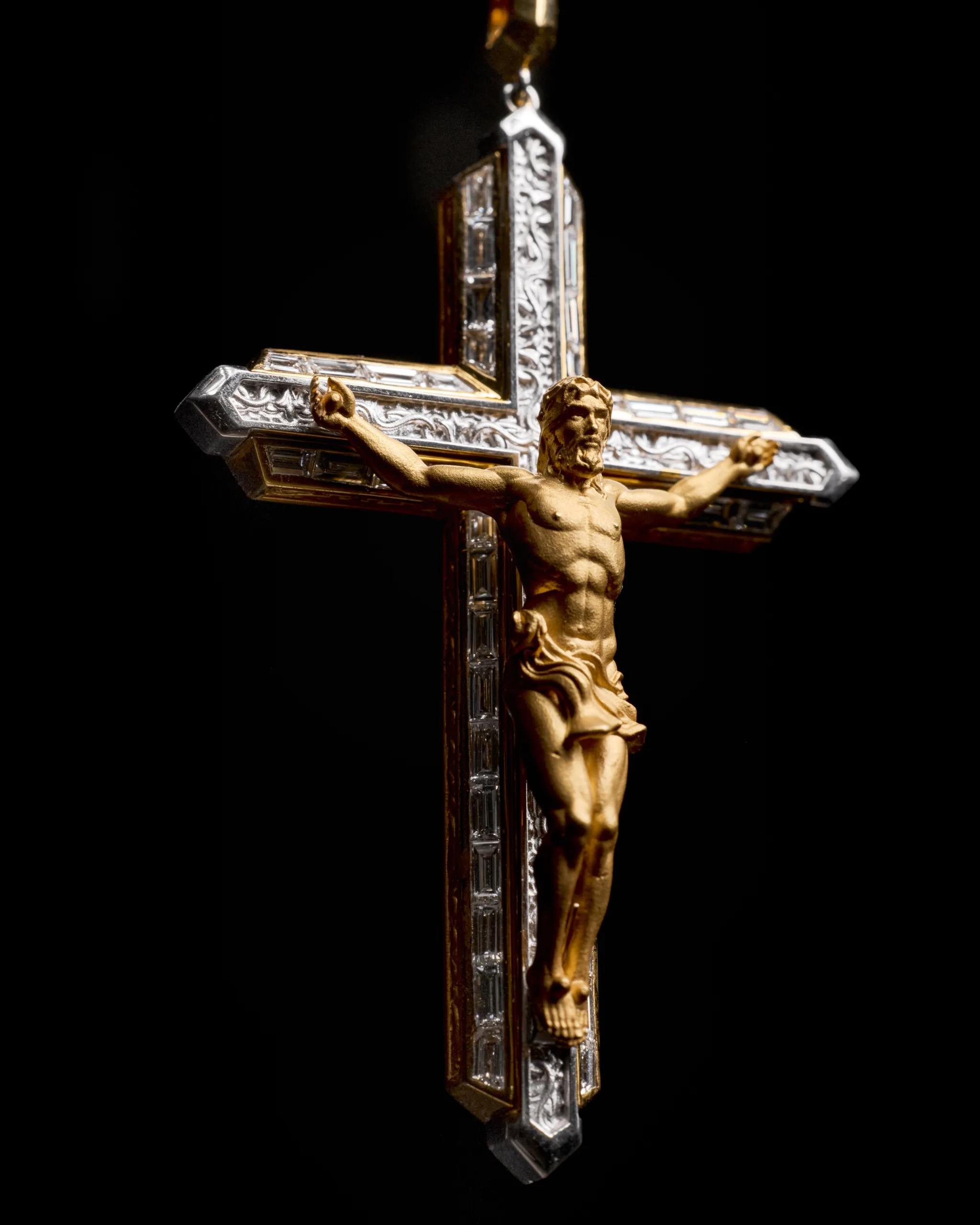 Made of 18K gold and diamonds, this unique piece resonates deeply with its wearer and honors the enduring spirit and strength of Jesus Christ, whose portrayal reflects the essence of faith, endurance and the unwavering bond between Jesus Christ and God during his ultimate sacrifice. The wearer is invited to share in this transcendent connection and be reminded that Jesus Christ is eternally living by our side.